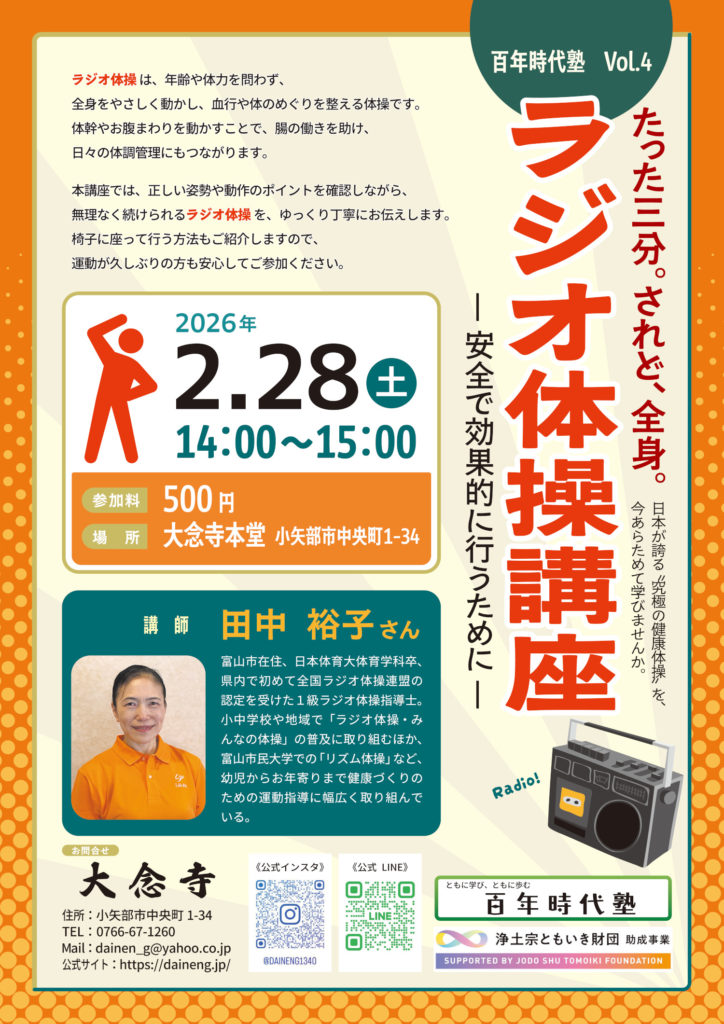 てらかつ 「ラジオ体操講座」開催します(第4回百年時代塾) 2026年2月11日 by kobayashi / 0件のコメント 日本人の誰もが知っている「ラジオ体操」、でも、きっと自己流になっているはずです。世の中いろんな健康法がありますが、正しく学んで、安全で効果的なラジオ体操にしませんか。こんな身近な体操が、超健康法に変わります。 FacebookXBlueskyCopy kobayashi